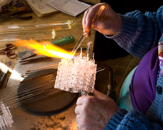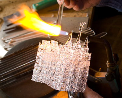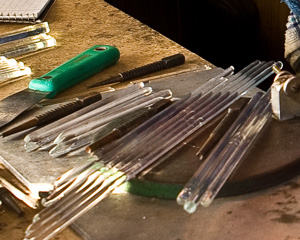 The acetylene torch heats the glass rods to temperatures between 2500° and 3000° F.